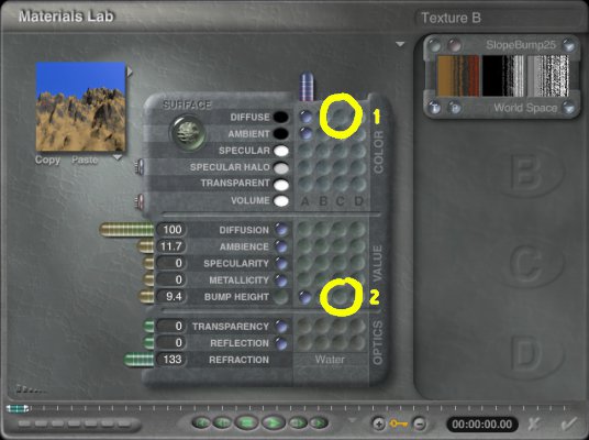 While holding down the Ctrl key, click on the 3rd dot in the Diffuse (1) and Bump Height (2) rows: