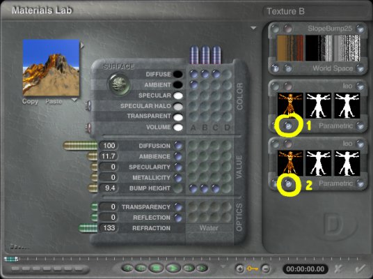 This will cause two additional textures to appear at the right side of the window. Click on the P dots (1 & 2) of the two new materials to change them to a picture texture: