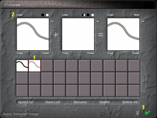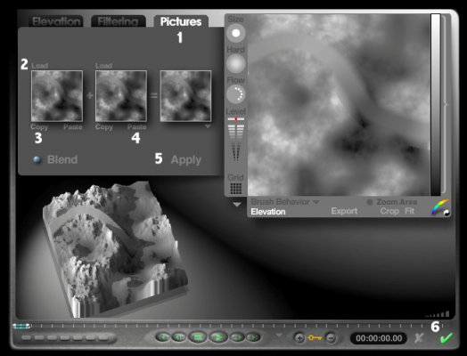 Click on the Picture button (1) located on the Elevation tab. Load the road map (e.g., filename_road.bmp). You could also use the Pictures tab (3) to load the road map but it takes more steps and fails to work properly in Bryce 6: