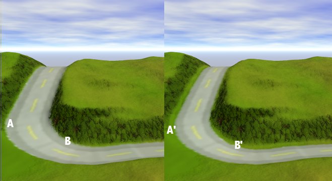 The cut and fill starts right at the edge of the road's shoulder as shown in A and B below. To show a strip of terrain next to the road, as shown at A' and B' below, you can make the road and/or shoulder just a little narrower. Adjust the scrollbars then update the road maps and save under a new name. Instead of using the original texture and alpha maps, use the new ones.