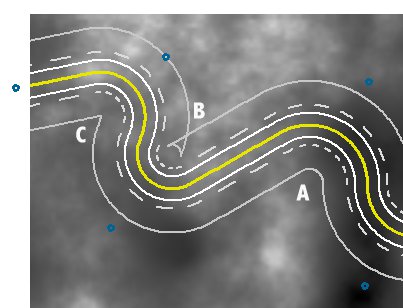 Dots can be placed anywhere in the draw window, but some positions can lead to problems with the resulting road. The following image shows a well-designed curve at A. B shows a place where the cut and fill line turns over on itself - this will not look good in the final road. C shows a sharp point in the cut and fill line - this will look OK in the final road.