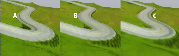 The curb height is set to zero when the program starts. It can be reset to a height of -50 to +50 from the road's surface. A little bit goes a long way. In the images below, the curb at A is set at -3 below the road (as seen by the dark shadow to the right of the letter). The curb at B is set to 0 (no shadow between the road and shoulder). The curb at C is set at +3 (the shadow cast by the curve can be seen on the right edge of the road).
