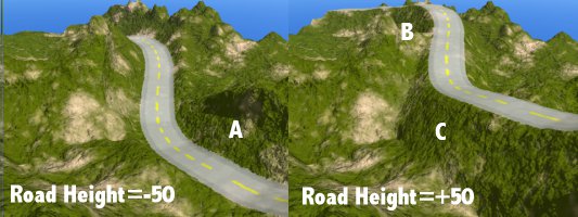 The road height is set to 5 when the program starts. It can be reset to a height of -50 to +50 from the original terrain's surface. The following image shows how the road changes between these two extremes. Notice how the road in the right image is much higher than that in the left image. The letter A indicates an area where the mountain has been cut away. The letters B and C indicate areas where there has been much fill: