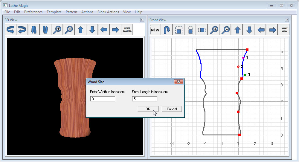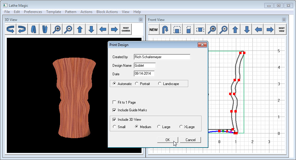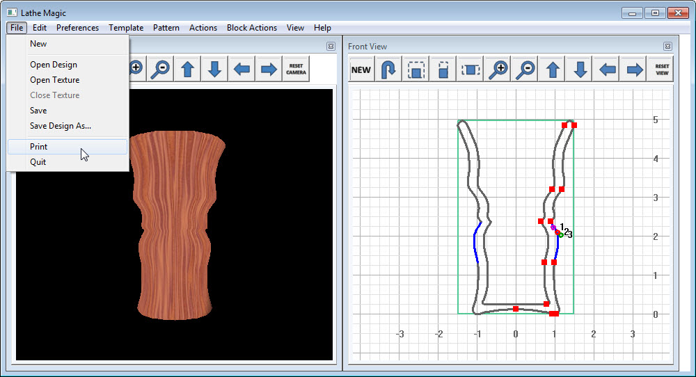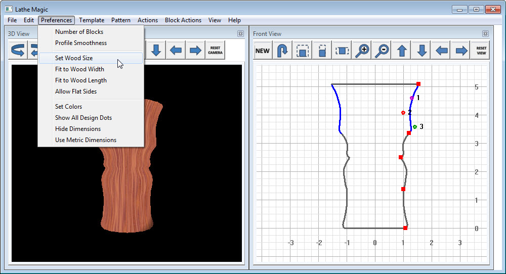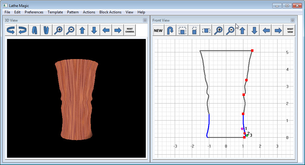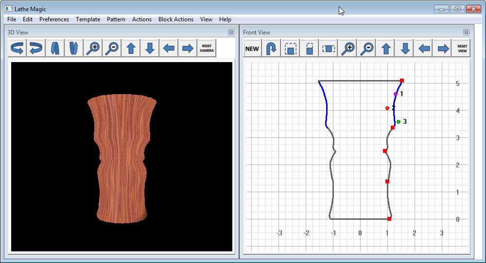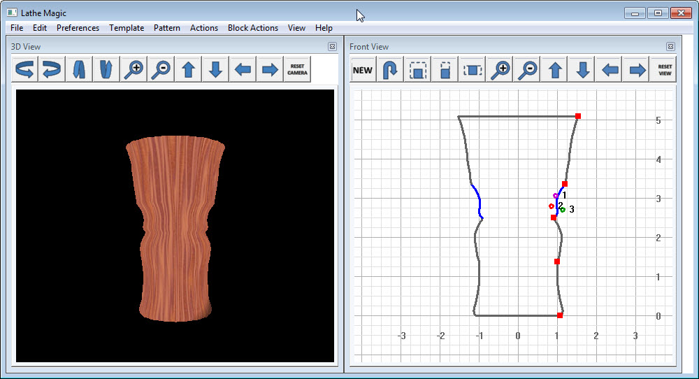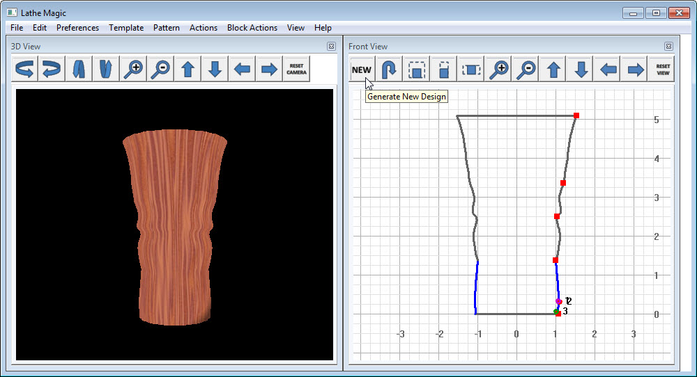 STEP 1. Every time you start Lathe Magic, a new design will be automatically created and displayed. Click on the NEW icon found at the top of the Front View window to create additional designs. Continue clicking on New until you see a design that appeals to you. In the image below, I found this design to be a good starting point for making a goblet.