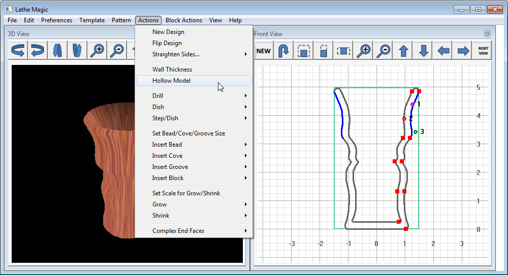 STEP 8. Up to now, the design has a solid top. You could manually add additional blocks to hollow the model, but there's an action already built in to the program that will do it for you. Click on menu item Actions then select Hollow Model as shown below. The program added the needed blocks and repeated the profile to make a hollow model. By tipping the 3D View forward, you can see that the design now has a hollow top
