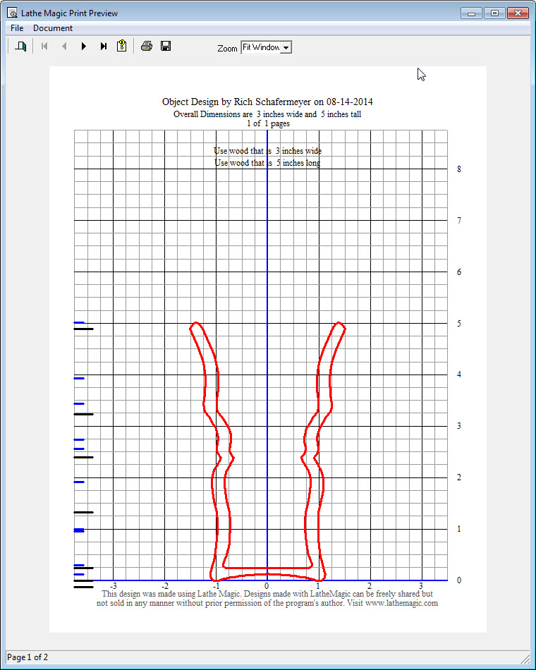 STEP 12. Another window will appear as shown below. Click on the printer icon to print a copy or click on the floppy disk icon to save a file for printing later. Along the left margin are a series of Guide Marks. These indicate where each block begins and ends (black guides) and also identifies where curve transitions occur (blue guides). The print out can be used as a template to help guide creating the object at the lathe.
