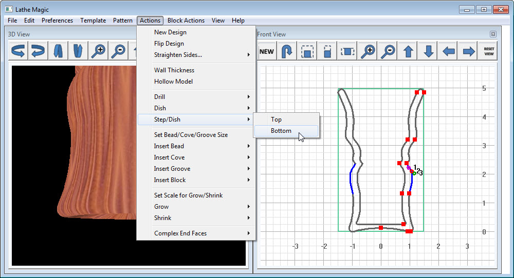 STEP 9. The design also has a flat bottom. If the bottom isn't flat after lathing, it may cause the goblet to wobble, so let's give it a slight indentation. Select menu item Actions and Step/Dish Bottom. This leaves a small flat rim and a slight upward curve to the bottom of the goblet. By tipping the 3D View back, you can see that the design now has an indentation in the bottom.