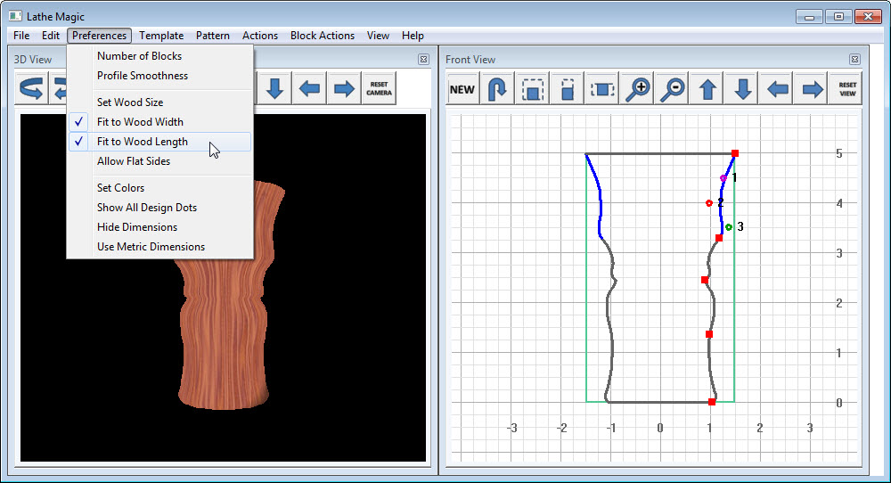 STEP 7. After setting the wood size, click on menu item Preferences and select Fit to Wood Width and Fit to Wood Length. Check marks will appear to show that designs will now be adjusted to match the wood size you entered in Step 6. The Front View will also show a green box which indicates the size of wood.