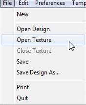 Changing TextureSelect menu item File-Open Texture. A standard Windows file dialog will open and a new texture can be selected. |