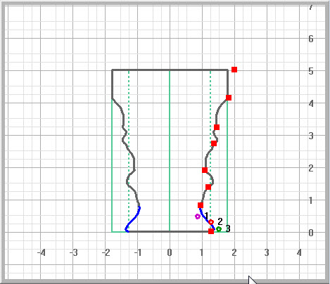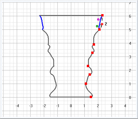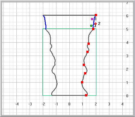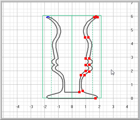 Example Using Flat SidesFor this example, I set the wood size to 6 inches tall by 3 inches wide. The central part of the vase is no wider than 3 inches so it is round. The upper lip and lower pedestal are 3.7 inches wide and fall within the dotted and solid green lines. This gives them both a cross-section with rounded corners and flat sides. |