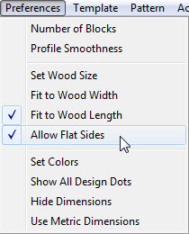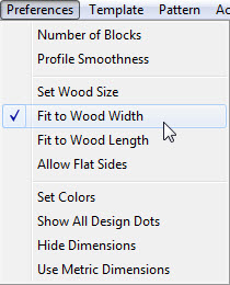 Fit to Wood WidthAfter setting the wood's size, you need to select how to use the wood size. Select menu item Preferences-Fit to Wood Width. A check mark will appear showing that the design will now be adjusted to fit the wood width specified in the wood size dialog. Any design generated by using the New button will match the width until Fit to Wood Width is selected again, turning off the check mark. |