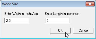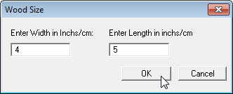 Set Wood SizeSelect menu item Preferences-Set Wood Size. A dialog box will open and the wood width and length can be set. |
