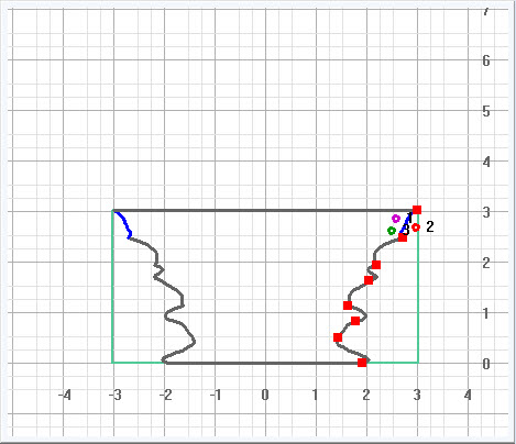 This is the same example we began with, after it was fitted to a 4 inch wood width and 5 inch wood length. With Allow Flat Sides turned on, the wood outline has been rotated 45 degrees. The two green dotted lines now mark the wood width (in this case, 4 inches wide). The solid green lines mark the width of the wood's diagonal (from one corner to the opposite corner; for example a 4 inch wide piece of wood will have a diagonal of 5.65 inches). As all parts of the design fit between the two dotted lines, there will be a circular cross-section throughout. |